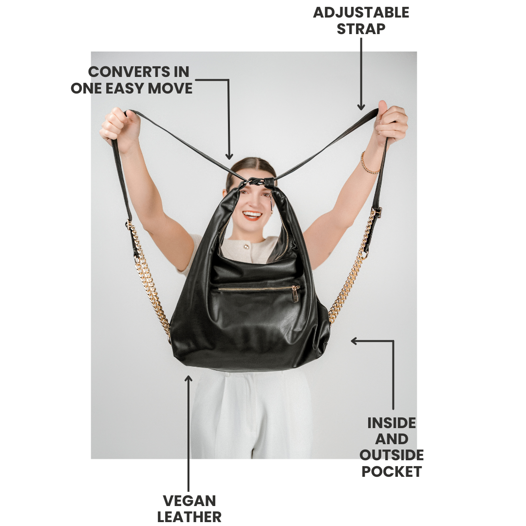 Effortlessly switch from a shoulder bag to a comfortable backpack with a simple pull of the strap—no clips, no adjustments.